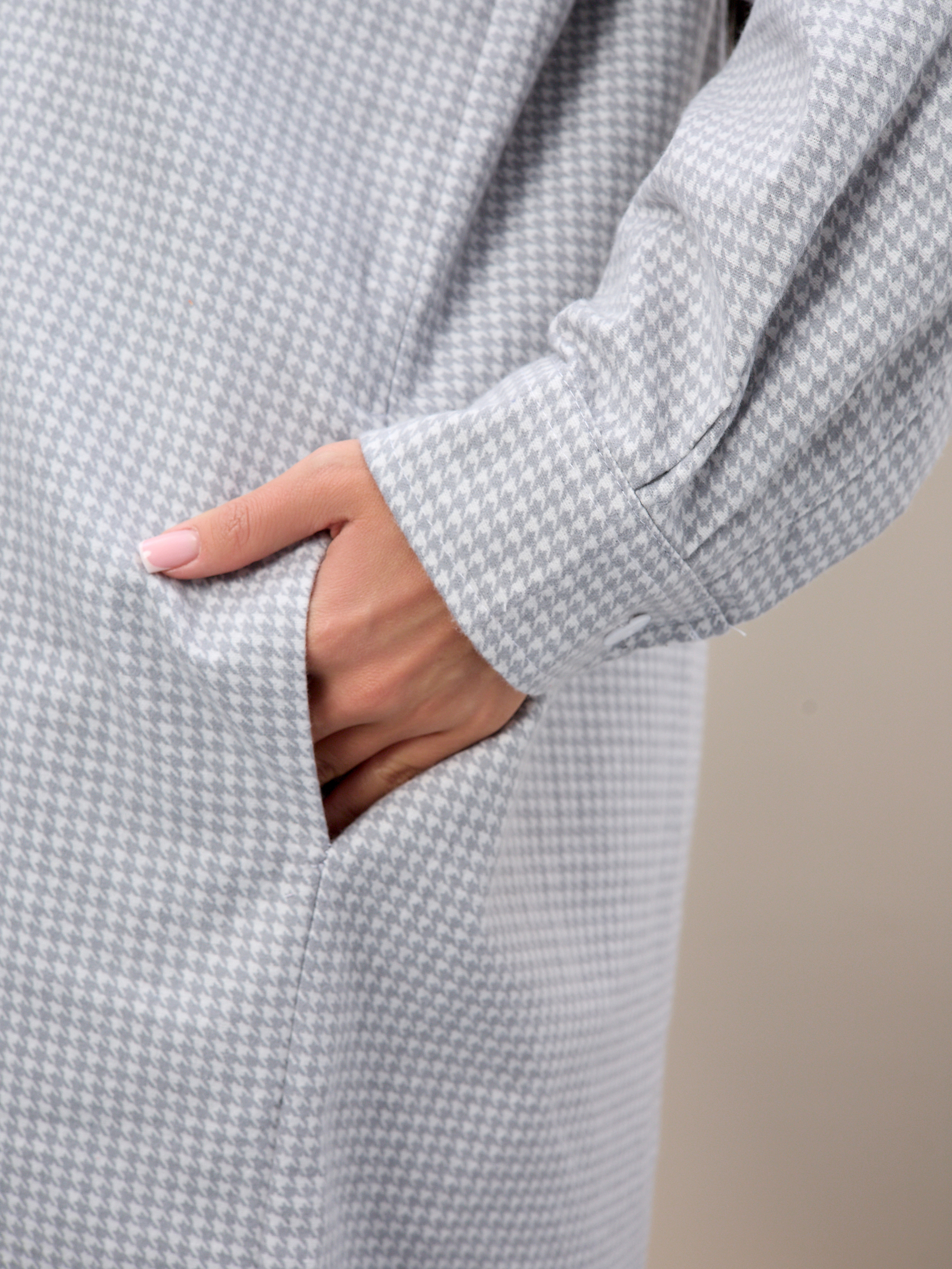 Этот халат с длинным рукавом и манжетами с пуговицами идеально подходит для холодных зимних дней, обеспечивая тепло и комфорт.